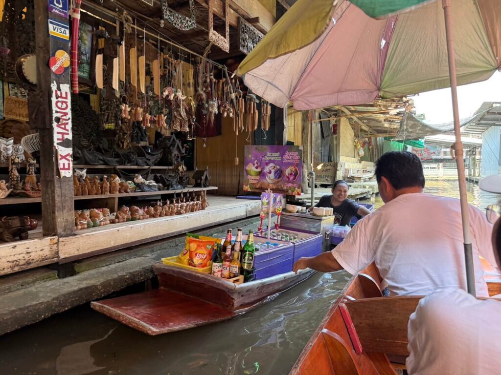 川の上を小舟が行き交い、船の上で果物や軽食、お土産などを売る風景はテレビでも見たことのある