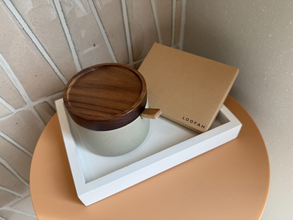ナチュラルウッドと白、ピンクを基調にした色合いで、独特なのに落ち着くデザイン。