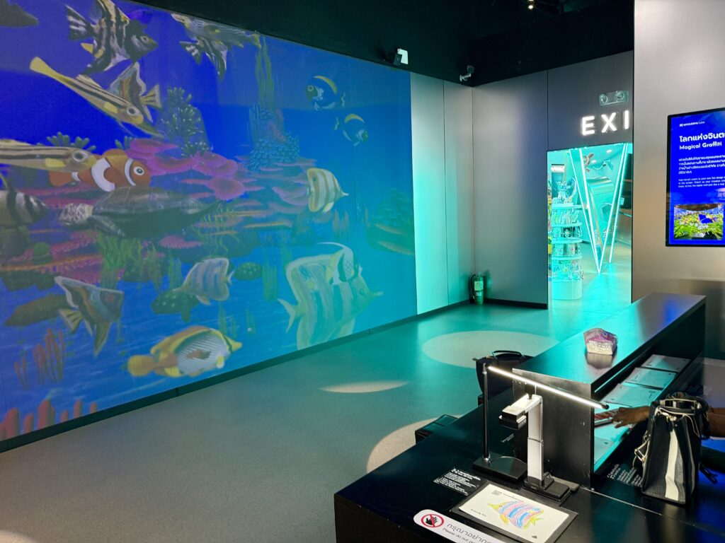 自分で塗った魚の絵が壁の中に入って泳ぎ始めるコーナーも!