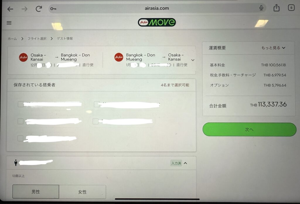 5,000円ほどのタイ国内線を予約した時は4人でたった50バーツの差だったので割引額はケースバイケースですが、一度試してみる価値がある簡単な裏技です♡