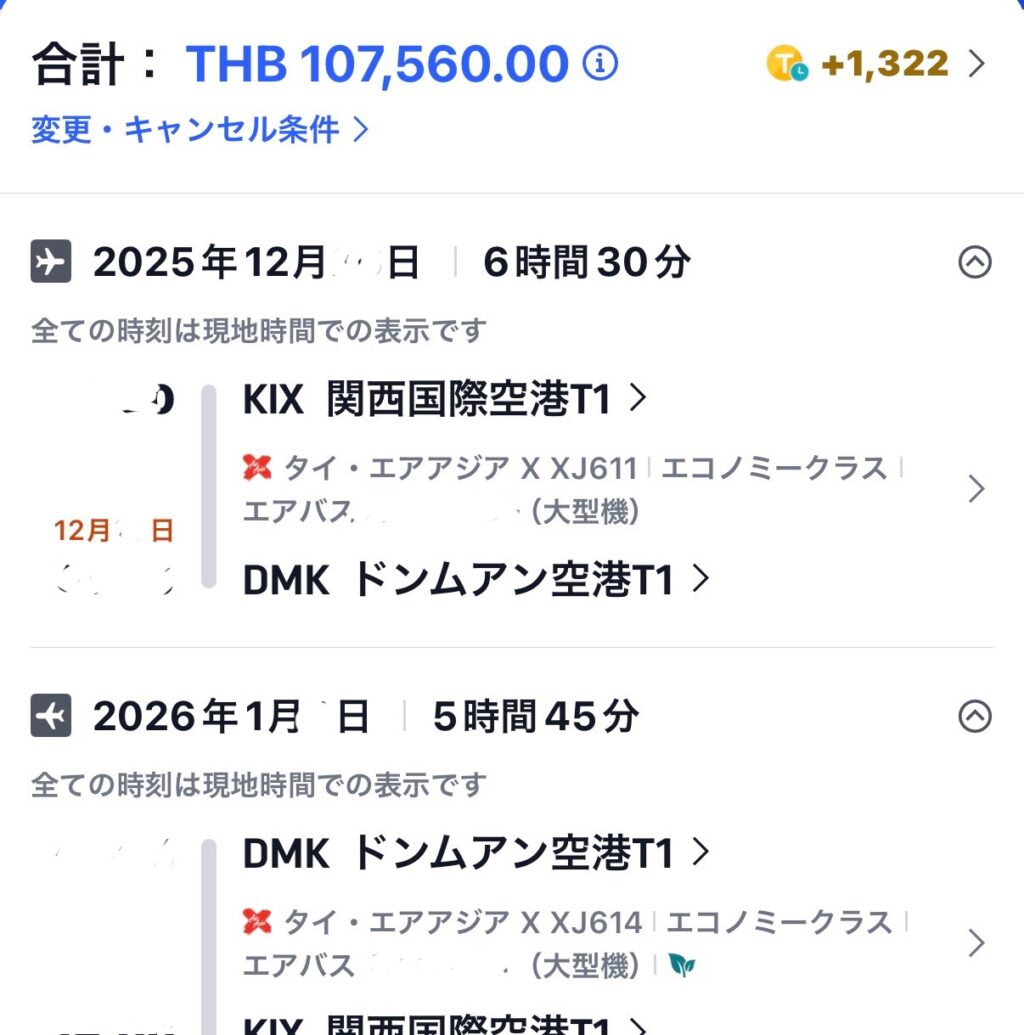 - 年末年始の関空↔︎バンコク便を4人で24,000円安く
